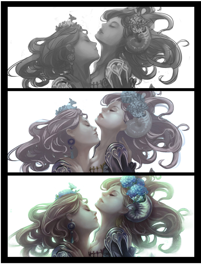 直人Blue:我的繪畫技法,大多都是用觀念來完成的,最主要也最常用的,就是灰階轉彩色的技法。